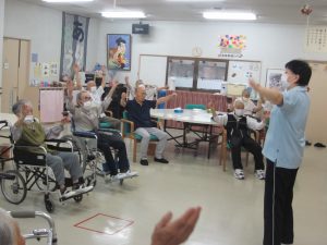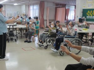 看護師と一緒に手、足を動かして体操を頑張っています!