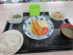 エビフライ、豆腐サラダ、青菜のごま和えでした