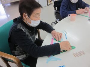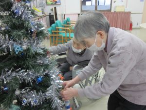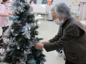 2023.12.06 日々の様子 12月に入りました。 センターではクリスマスツリーの飾りつけや飾り作りをしています🌲 壁に飾る手作りツリー🌲 熱心に作業されてますね たくさんシール貼りました! 少し早いですが… クリスマス気分で写真撮りました☆ クリスマス会もお楽しみに!