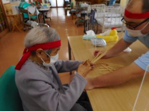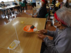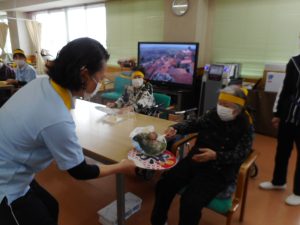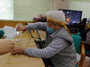 2022.04.11 お知らせ 運動会をしました。 3月は運動会がありました。紅組と白組に別れ 皆さん負けないように頑張られていました。 皆さん、桶を太鼓にして3・3・7拍子を叩いてもらいました。 競技ではお手玉送りを行いました。 うちわでお手玉を落とさないように、皆さん真剣な表情でお手玉を渡していました。 2回目の競技では箸出しゲームを行いました。 箸がなかなか出なかったりしたのですが 箸を入れる時には、箸を分けて入れるなど、工夫して皆さんやっていました。