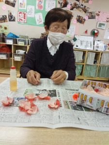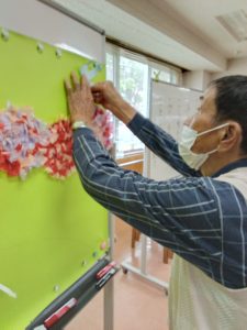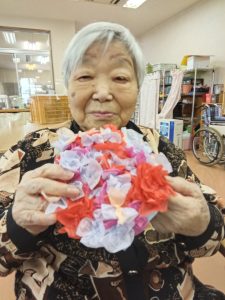 2024.06.12 日々の様子 ある日のデイサービス 5月のある日、お客様で紫陽花の壁飾りを作りました🌼 花びらをノリで貼って大きな紫陽花を作ります。 できた紫陽花を画用紙に貼って完成です☆ 壁飾りを背景に記念撮影を行いました😊