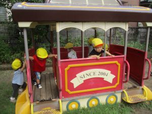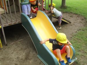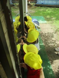 2021.08.18 日々の様子 園庭で遊びました つぼみ組 お盆を過ぎて、暑さもゆるみました。涼しい風が吹いていたので1歳児のつぼみ組さんは久し振りに園庭で遊びました。お外のプール、水遊びが続いていたので外遊びは久し振りです。 保育園のうさぎさんにも会いに行きました。うさぎさんのお家にずらりと並んで見ています。また会いに来るね。