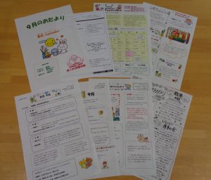 もうすぐ8月も終わります。保護者の皆様には9月のおたよりをスマホアプリにお送りしました。第二はじめ保育園では、月末に翌月のはじめだより(園だより)、ほけんだより、食育だより、献立表、育児に関するおたより、クラスだよりなどをまとめてアプリにお送りしています。紙での配布を希望する方には紙でお渡ししています。献立表などはお家で貼って親子でメニューを確かめているそうです。