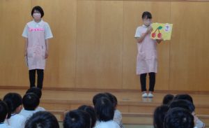 今日はひまわり幼児教育専門学院の学生が半日の実習にきました。実習は初めてとのことできっと緊張しながら来たことでしょう。初めに自分で作った小物を使いながら自己紹介をしてもらいました。