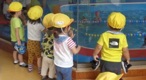 そして今日は先週につづき、3歳以上児さんの水泳指導でした。1歳児のつぼみ組さんは外遊びからの帰りに、ガラス越しに眺めていました。玄関にプールがあるので、片付ける靴を持ったままプールにくぎ付けなのが、かわいいです。