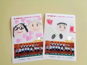 9月20日(月)は敬老の日。コロナ禍前までは園児の祖父母の皆さんをお招きしていたほのぼのクラブの集いもできずにいます。離れて暮らす方はなかなか会うこともできないのではないでしょうか。保育園ではおじいちゃん、おばあちゃんにはがきを用意しました。親御さんを通じてお手元に届いてくれると嬉しいです。
