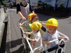 1歳児のつぼみ組さんはカートに乗って近所を散歩してきました。何を見てきたかな?