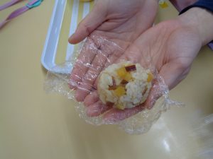 頑張った今日のおやつは、先日収穫したさつま芋が入ったおにぎりでした🍙