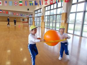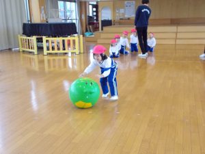 4歳児きく組さんは、”ボール運び”と”転がしドッチボール”