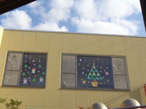 また、保育園の窓にクリスマスがやってきました。どこの窓か分かりますか?道路からも見えますのでご覧ください。