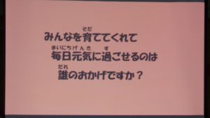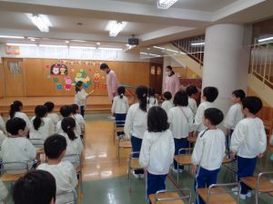 会では、感謝を伝える日であることや、お仕事クイズ、クラスの歌の発表がありました。
