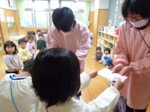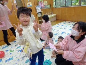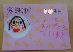 5歳児ばら組さんは、会が終わってから各保育室をまわり、保育園の全職員に書いた感謝状を渡しました。似顔絵もあります。赤ちゃんのクラスの先生にも渡しました。