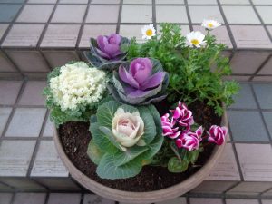 玄関の鉢植えも冬の花に。先週末にはあられも降りましたね。