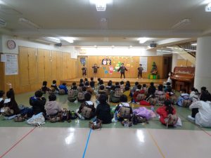 今日の夕方、いつもは紙芝居の読み聞かせやパネルシアターのお話を見る時間にステージでお遊戯を踊っていました。