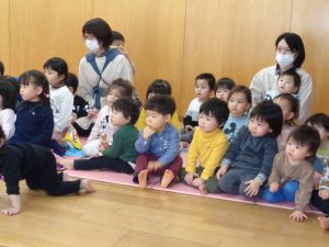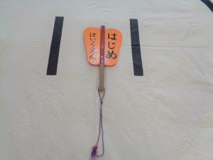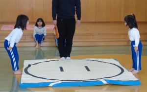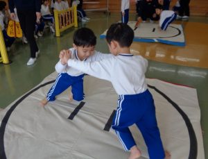 マットの土俵でクラス別に取組ます。保育園の軍配もあります。