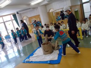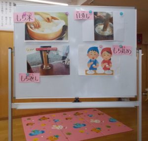 2022.01.14 日々の様子 もちつき会 今日は餅つき会でした。 最近では目にしなくなった杵と臼でつく餅つきを、子どもたちに見せたい思いから 餅つきをしています。 もち米、めつぶし、餅返し、臼、杵などの言葉も伝えます。 「昔は餅つきは、誕生、入学、就職、結婚、家を建てるなど、 おめでたいことがある時につきました。今日は新しい年を祝ってつきます。」 と園長先生に教わりました。 5歳児さんもつきました。小さな杵でも扱いが難しそうでした。 玄関には、先日の書初めを掲示しました。
