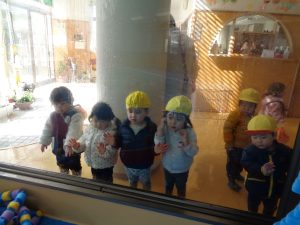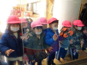 他のクラスの子もガラス越しに見ていました。