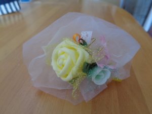卒園児さんの胸に付けたコサージュは3歳児の先生の手作りです。違うクラスでも卒園式に向けて、いい卒園式になるように準備をしてこの日を迎えました。