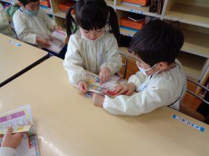 新しいお部屋で、新しい担任の先生から、新しいシール帳を受け取り嬉しそうにページをめくっていました。