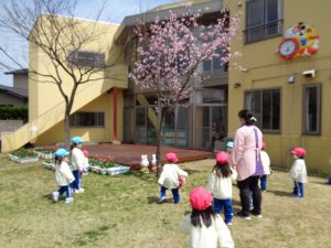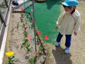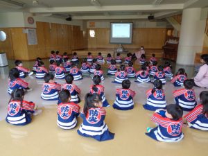 2022.04.11 日々の様子 チューリップが咲きました 昨日、今日ととても気温が上がりましたね。昨日のお休みには「桜、見に行ったよ」というお友達がたくさんいました。どこもきれいに咲いていますね。 保育園でも春の花がきれいに咲いています。 今日は幼年消防クラブ、交通安全教室、映写会でした。 法被を着て参加します。 背中には「防火」と書いてあります。 防火や交通安全についてお話をします。「聞いたお話は、お家の人にも教えてあげましょう」と伝えています。お家で話していますでしょうか。