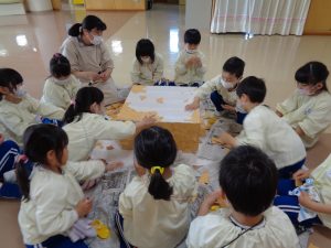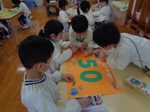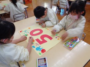 今日は保育園50周年(50歳)のお祝いのケーキ作りをしました。