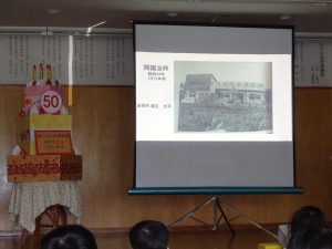 50年前、古い園舎の写真や昔の制服、はじめ保育園の園歌のお話を大きなスクリーンで見ました。