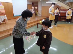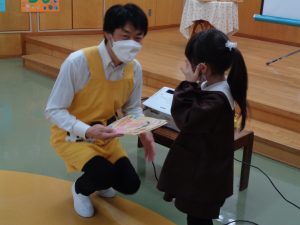 最後に、理事長先生や園長先生に絵や写真をまとめたものを記念にプレゼントしました。