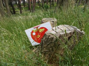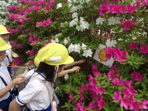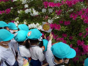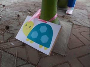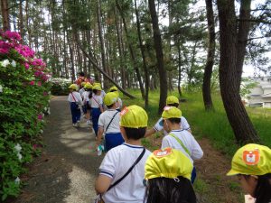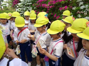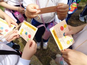 2022.05.12 日々の様子 ウキウキツアーでスタンプラリー 今日はウキウキツアーであやめ・きく・ばら組さんで河渡中央公園に行ってきました。 きく・ばら組さんは松林の中でスタンプラリーをしました。初めてだったので、とてもワクワクしていました。 見つけたら先生からシールをもらいカードに貼ります。 「こっちの道にありそう!」「かめが見つからない」「きく組さんにかめがここあることは内緒だよ」などととても楽しんでいました。