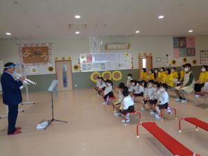 ”おたのしみ”防犯講座ということで講師のトランペットでの演奏(さんぽ・ドレミの歌などなど)を挟みながら楽しくお話してくださいました。