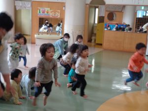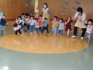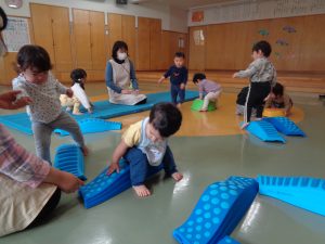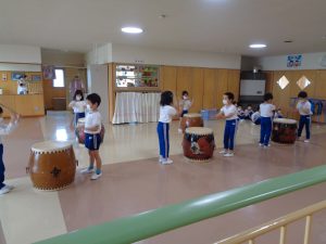 2022.06.08 日々の様子 1,2歳児さんのホール遊び 今日ホールでは2歳児さんと1歳児さんが遊んでいました。 1才児さんは波型の平均台で上手にバランスをとって歩いていました。 2才児さんはソフト積み木やブロックで遊び、その後は変身ごっこをしていました。 おすもうさんや、カエルさん、子ども達からのリクエストで「わに」や「ゴリラ」にも変身しました。 カエルさんになったお友達、ぴょーんと跳ねていますね。 ばら組さんは、今日初めて本物の和太鼓で練習をしました。みんな張り切っていました。