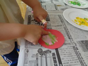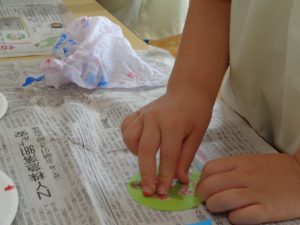 今日、3,4,5歳児さんは「ゆび絵の具」で制作をしました。