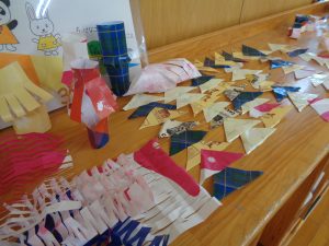 ちょうちんや天の川、三角つなぎや輪つなぎなど、七夕ならではの古くからある飾りを作りました。