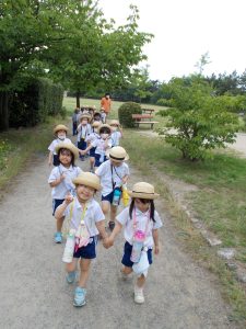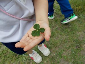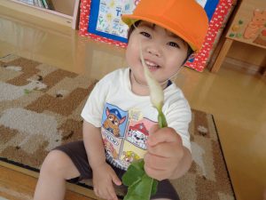 2022.06.23 日々の様子 ウキウキツアー 今日は、ウキウキツアーで山の下海浜公園に行ってきました。🚌 遊具で遊んだり、芝生などを散策しました。 芝生では四つ葉のクローバーを見つけました。 保育園では、たんぽぽ組さんがゆび絵の具をしていました。 真剣に指で描いていますね。 その後、園庭に行ったたんぽぽ組さんは、プランターで育てているミニ大根を収穫と間引きを兼ねて抜いてみました。 今後も次々に大きくなると思うので、また収穫しましょうね。