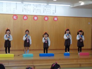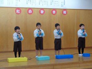 今日は、紅白歌合戦でした。紅白に分かれて、これまでにクラスで歌ってきた歌を、ステージに立ち本物のマイクで歌います。5~3人で歌うのでまさに一人ひとりが主役です。