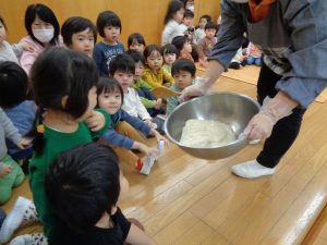 子ども達に今ではなかなか見られない杵と臼でつく餅つきを見てもらうことが出来ました。
