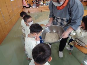 初めに蒸したもち米を見せ、どんどんのびていくお餅の経過を見ながら楽しみに待ちました。