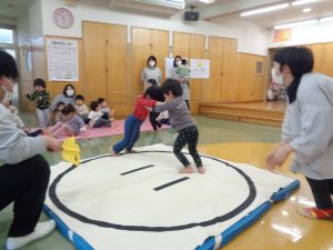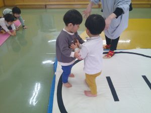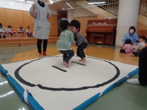 今日はたんぽぽ組(2歳児)さん、つぼみ組(1歳児)さんのお相撲をしました。