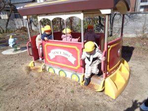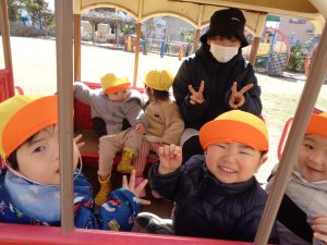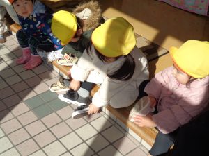 つぼみ組の1歳児さんもお外へ遊びに行きました。お靴も自分で履いていますよ。