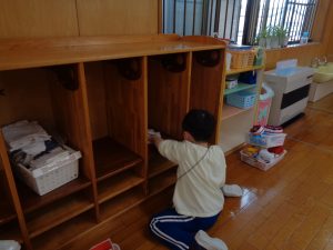 2023.03.23 日々の様子 お部屋のお掃除 卒園式を明日に控え、ばら組さんは1年間使ったお部屋の掃除をしました。 感謝を込めて、床も棚もきれいにしました。 清々しい気持ちで卒園式を迎えられますね。