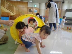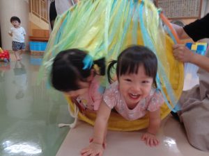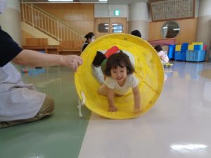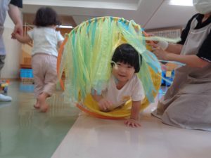 2023.08.30 日々の様子 トンネルで遊んだよ 昨日になりますが、1歳児のつぼみ組さんは、トンネルで遊びました。 すぐに入っていく子、出口で様子をうかがう子、中で座ってみんなに追い越される子様々です。 出口にすずらんテープをぶら下げると、一層楽しんでいました。