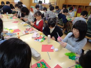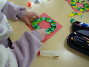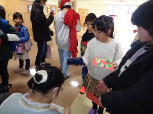 2023.12.16 日々の様子 フレンズクラブ・クリスマス会 今日はフレンズクラブ(卒園児の会)でクリスマス会でした。 30人以上の卒園児さんが集まってくれました。 背の高い6年生を見上げて立ち止まる1歳児さんが可愛らしかったです 保育園児の子と朝の集まりをした後には、リースを作りました。 ご参加ありがとうございました。 次回は3月16日(土)、6年生には卒園の時にお預かりしたタイムカプセルをお返しします。