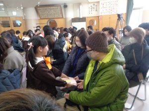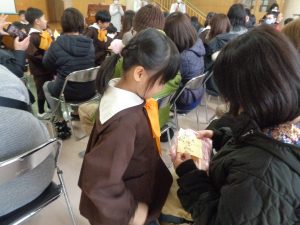 最後に、ばら組さんがひと針ひと針縫った雑巾をお家の人にプレゼントしました。
