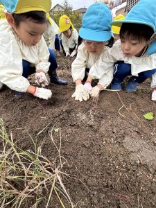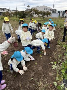 2・3歳児さんは保育園の園庭の畑で、4・5歳児さんは親永会の畑で行いました。