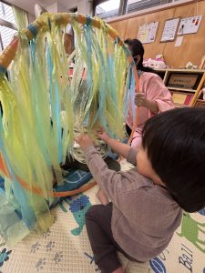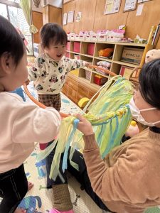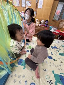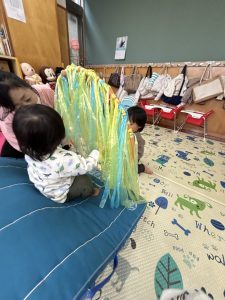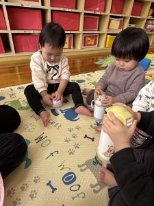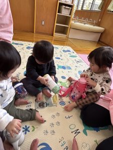 2025.01.24 日々の様子 0歳児さんの遊び 昨日の0歳児クラス遊びの様子です。フラフープにテープを付けたものを挟んで2人で座っていますね。 0歳児のクラスでもこんなにお友だちと楽しさを共有できるのですね。 おともだちを並んでお茶を飲む姿もほのぼのとしてかわいいです。 となりのお友だちは何をしているのかな??