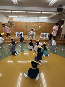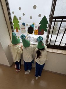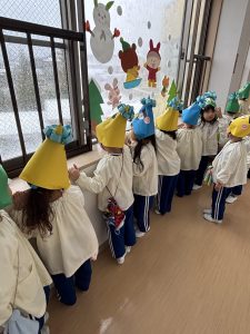 お面ができあがったあやめ組さん(3歳児)は被って写真を撮っていました。普段は行かないばら組さん(5歳児)さんのお部屋の前で撮っていました。普段は行かないので廊下の窓から見る景色が新鮮だったようです。