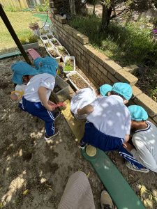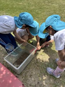 2025.05.27 日々の様子 虫探し 園庭に出ると、すぐに虫探しを始めるばら組さん。 プランターの下など、虫がいそうな場所が分かっていて「ここはどうかな」と動かしたり、先生に動かしてもらって虫を集めています。主にダンゴムシです。 子どもたちは、砂場の脇の日陰のプランターの下は湿っていてダンゴムシのたまり場と心得ていて、動かすと大きなダンゴムシが現れました。 しばらく虫ブームは続きそうです。