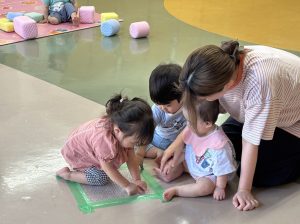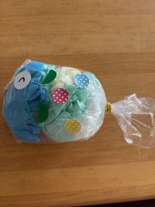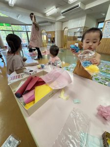 今日は1歳未満のお友だちでしたので、おはながみをクシュクシュして袋に詰めて、シールのうろこを貼り、お魚を作りました。うさちゃんクラブのお友だちもお母さんと一緒におはながみの柔らかい感触を楽しんでいましたよ。