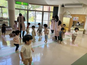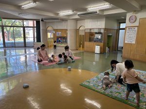 保育園に通っていないお友だちさんが遊びに来てくれて、つぼみ組(0・1歳児)さんとホールで遊びました。