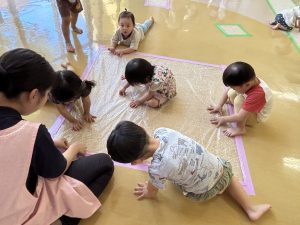 終わってから、2歳児のたんぽぽ組さんがプチプチで遊びました。
