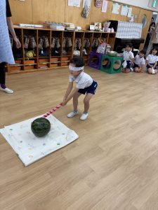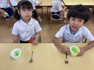 そして、給食、お昼寝を挟み、お待ちかねの午後のおやつはかき氷🍧!好きな色のシロップをかけました。